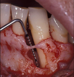 レントゲンと一致して深い骨欠損がありました。徹底的に根の表面をきれいにしました。